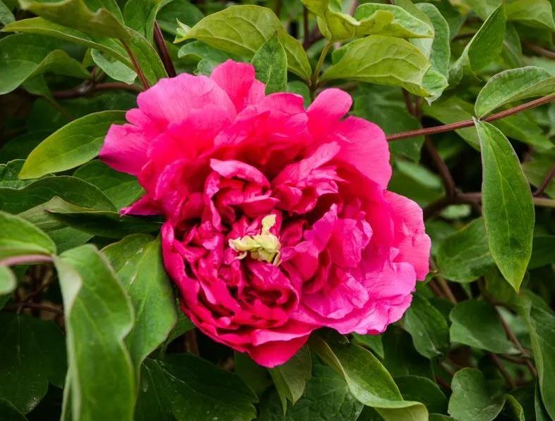 楼子台阁型。花深紫红色,有绿色彩瓣。株型矮,开展。大型长叶,墨绿色。成花率低,中花品种。传统品种。